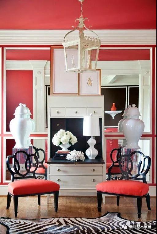 红色与黑色一直以来都是纯色中两大火热的色系神秘的黑色搭配热情的红色犹如一颗碳石撞进熊熊烈火里这样的软装搭配看了让人充满欲望感星星红色遍布客厅墙壁运用黑白金三色点缀装饰