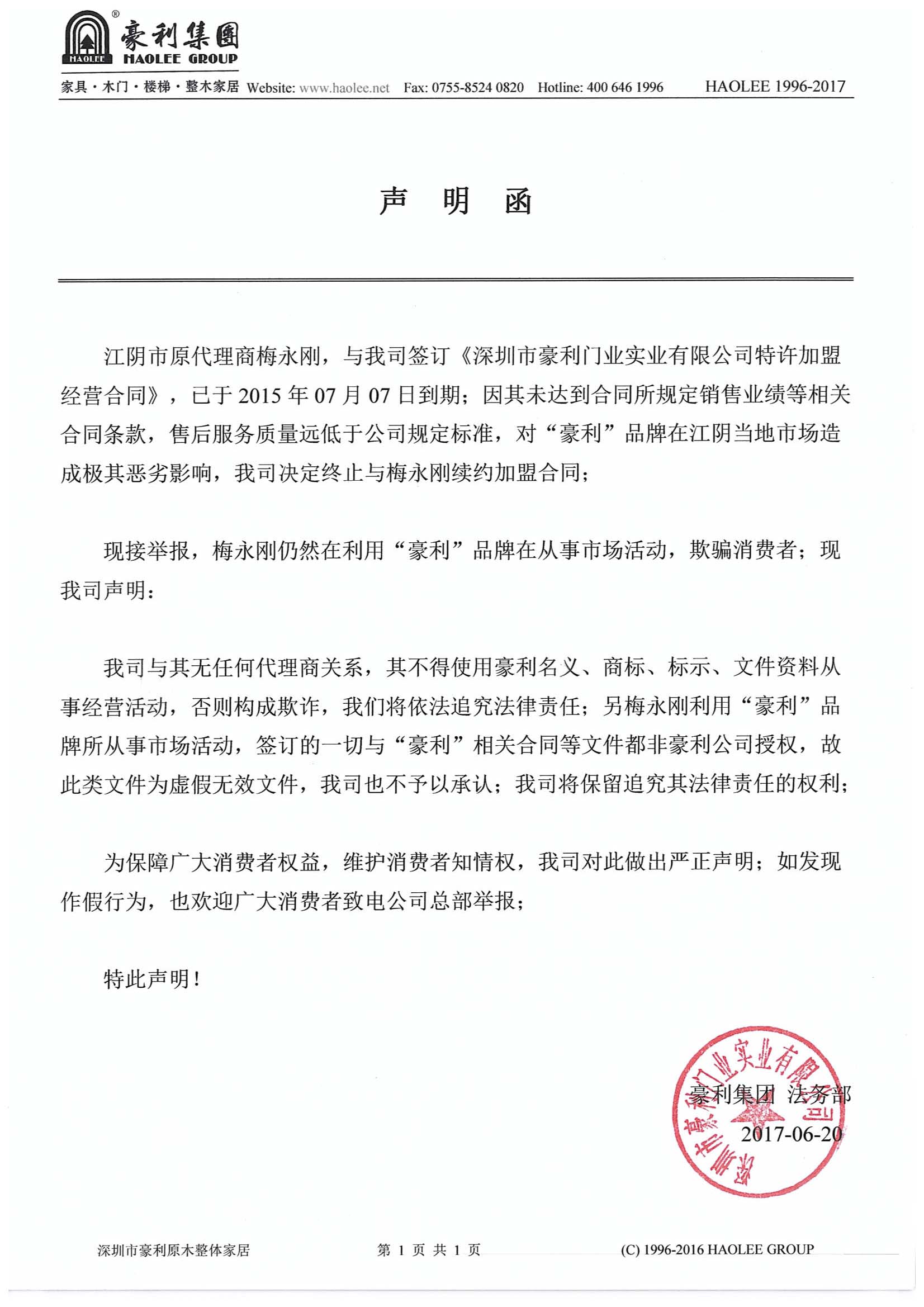 声明:江阴市原代理商梅永刚与我公司已解除合约,对于其解约后仍使用豪利品牌进行市场活动,欺骗消费者、损害豪利品牌形象的行为,