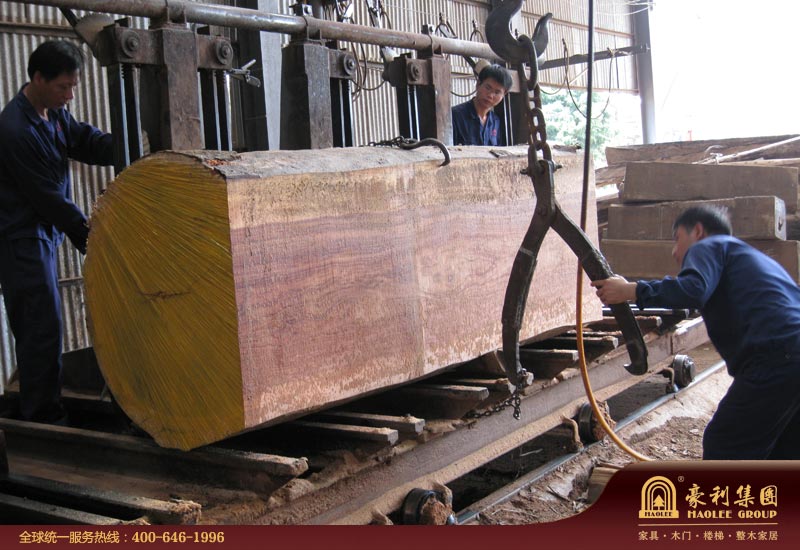 图15:在开料车间,工人们将硕大的树干锯切成一张张标准厚度的板材。