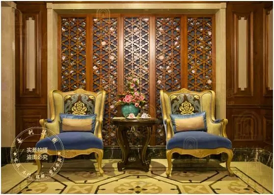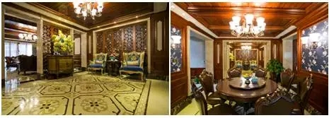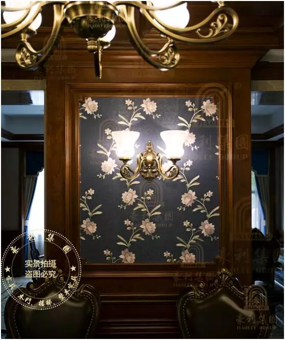 暖黄的色调,带给家温馨、柔软的感觉。开得蓬勃而灿烂的鲜花、花开富贵纹样的墙纸、以及座椅上雕刻的花纹,相互呼应着,再加上原木的镂空雕花屏风和透花底纹的背景墙……富贵浪漫的元素在这个空间一起绽放,构成了一副美如中国旧时的富庶人家的居家图景。