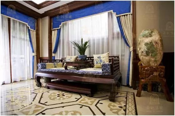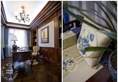 在原木家装的平实温润和乳白的主色调里,主人在软装用色上最大的一个突破就是蓝色元素的运用。蓝色是一种宁静、优雅、充满灵性的色彩,在古代欧洲被视为高贵、纯洁的颜色,所以皇室贵族血脉也往往被称为"蓝色的血"。主人颇为用心地使用蓝色元素,在各个空间相互点缀和呼应,既给空间增添了宁静、清新的气息,浓淡相宜的颜色搭配和青花瓷一般的图案选择,也体现了主人高雅、精致的品味。