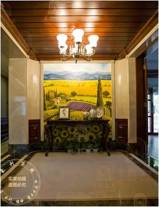别墅的吊顶天花板,多采用美式横木板做装饰。柔和的灯光,落在层次分明的原木板上,给家更添温暖、质朴的味道。而墙壁上画着的色彩饱满的、秋收稻田农庄的油画,搭配质朴的陶瓷装饰器皿,展现着生活的丰富、美好和灿烂。而主人对于生活的热爱和文艺气息,就在这么寥寥几笔中,被惟妙惟肖地勾勒了出来。