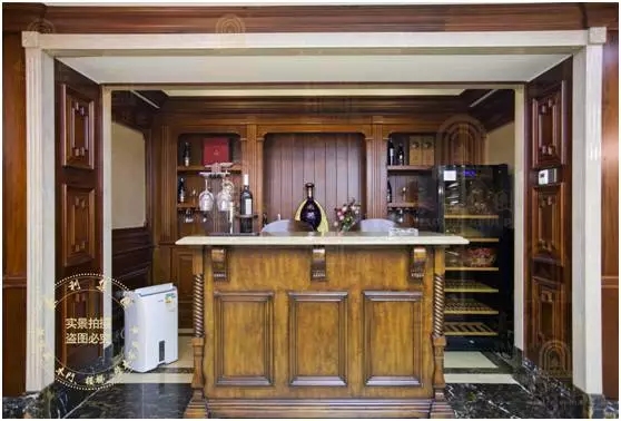 小小的吧台区,设计了原木展示柜和仿古吧台,吧台上简约的雕花、案几上精细的花艺摆件,并没有繁复的装饰和雕刻,反倒显得古朴而精致,小小的天地也别有一番韵味!