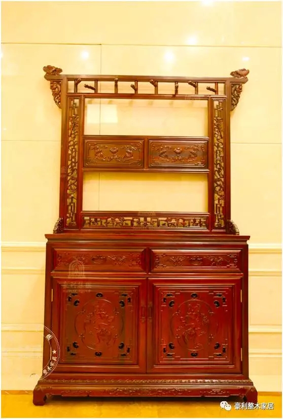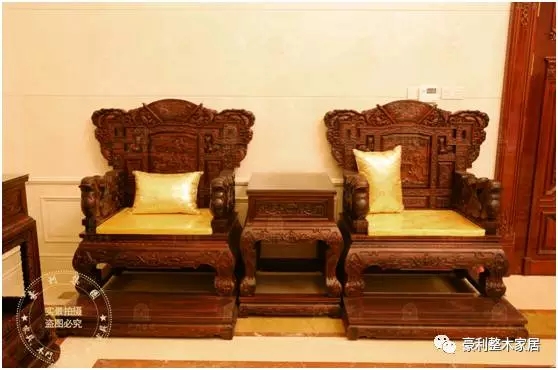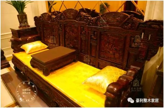 黑酸枝沙发上雕刻着栩栩如生的人物山水画,祥云、松柏、亭台楼阁穿插其中,一派吉瑞、祥和、喜庆之气,体现着中国传统艺术和木雕文化的博大精深!