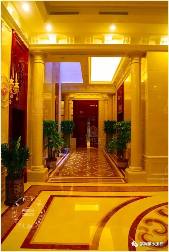 门厅统一用深棕色和乳黄色装饰,玻璃墙面拉长了空间视觉感,欧式水晶吊灯点缀其中,整个空间给人深沉严肃而又不失通透的感觉,尊贵气度,彰显无遗!