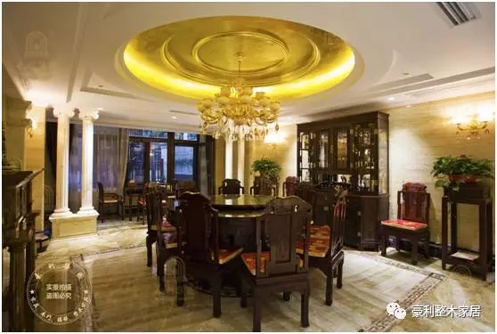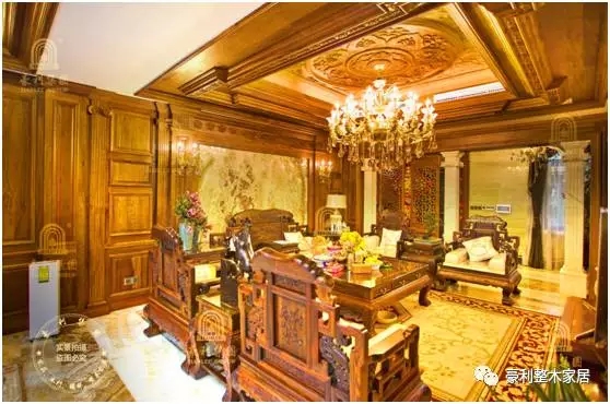 客厅用缅甸花梨木、大理石墙板、红木古典沙发打造出浓墨重彩的一笔!结构匀细、纹理交错的缅花木和细密的大理石纹相映成辉,明黄的色调彰显着尊贵、经典的韵味,至于造型精致、寓意考究的中式雕花和红木摆件,营造的一派祥和之气不言而寓。