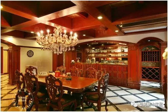 餐厅和酒窖连为一体,吧台的设计巧妙地将两个空间相联系、相区隔,这是一个经典的美式空间,原木用来装点这样的空间最合适不过。大气的原木桌椅和吧台,与聚散有致的光线、光亮的玻璃酒橱、旧式留声机烘托出一个醉人的美式用餐场景。