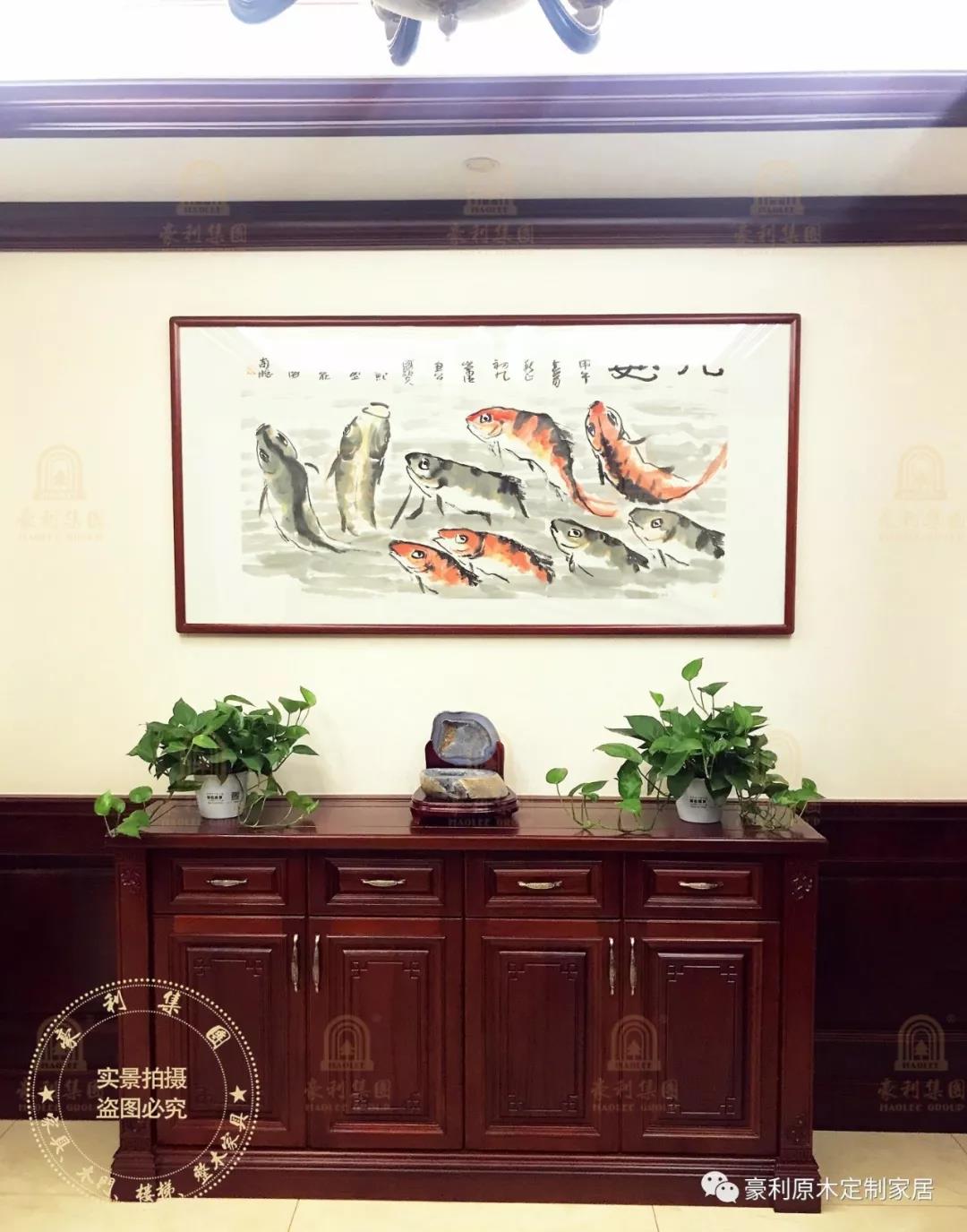 整个玄关的布局美观大方,让人眼前一亮。璧上吉利的装饰画《九如》,由九条活鱼组成,将江南水乡、鱼米之乡的意蕴舒缓,又将吉庆祥瑞道出,极富天工巧思。经主人悉心照料的绿植,赋予整个玄关气韵,独具特色的吊灯,凝结古典元素的吊顶,诉不尽主人对中式深深情思。